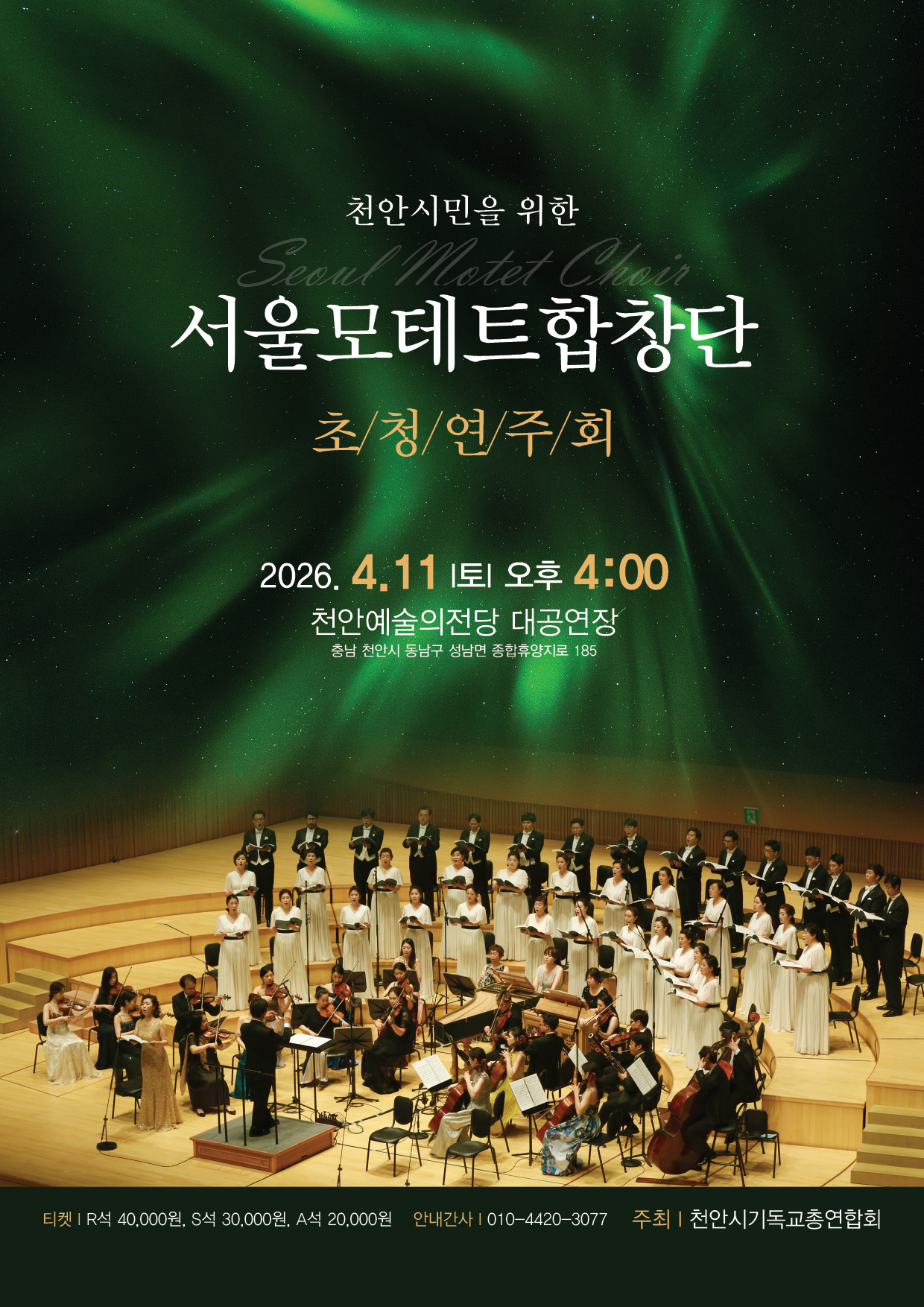 천안시기독교총연합회가 주최하는 서울모테트합창단 초청연주회가 오는 4월 11일(토) 오후 4시 천안예술의전당 대공연장에서 열린다. 이번 공연은 천안 시민을 위한 문화행사로 마련됐으며, 국내 대표 합창단 가운데 하나인 서울모테트합창단이 출연해 수준 높은 합창 무대를 선보일 예정이다.